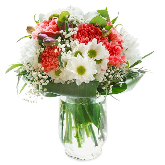 There's a tangible sense of joy and freshness in this bouquet, arranged with artistry and care by a local Old Malden florist attuned to the neighbourhood's character. The vibrant ruffles of coral, peach, and fire-red carnations invite you to linger, each petal layered in gentle waves that shimmer in the soft, even lighting. Sprightly white daisies with golden-green eyes peek out from between the carnations, their cheerful presence echoing spring days spent around Manor Park or strolls along the Hogsmill. Baby's breath is skilfully scattered throughout, creating a misty, ethereal effect that softens every edge and adds a touch of innocence. A few violet-tinged buds emerge subtly from the arrangement, suggesting new beginnings and a touch of intrigue. Encompassing all of this, deep green leaves arch in bold, glossy curves, cradling the flowers and forming a natural, luxuriant base. Everything is nestled upright within a pristine white gift bag, its white ribbon handles neatly looped above, ready for hand delivery across Old Malden-from bustling local cafes to the peaceful corners of West Barnes. The bouquet glows with a celebratory air, making it ideal for birthdays, thanks, anniversaries, or just brightening a friend's day. With every detail carefully composed, this bouquet is an elegant tribute to the vibrant community spirit found in Old Malden, and a beautiful gesture of affection and connection. This bouquet, radiating with spring's optimism, is arranged to capture the essence of joy and renewal in Old Malden. At its center, crisp white daisies glow with golden-green eyes, surrounded by plush coral-pink carnations whose layered petals add volume and complexity, much like the lively tulip beds of Manor Park. Clusters of cloud-like gypsophila scatter light and softness across the bouquet, their small white blossoms resembling scattered stars on a dewy morning. Eucalyptus sprigs and hints of budding alstroemeria offer muted green and blush undertones that blend harmoniously, infusing the bouquet with gentle scent and local authenticity. The design channels the care and attention of Old Malden florists, making it perfectly suited for congratulating a friend, honouring a beloved family member, or sending warmth across the area. The palette and form evoke a quiet celebration-a thoughtful gift for any special occasion or for brightening an ordinary day, with every detail lovingly reflective of the neighbourhood's peaceful beauty and cheerful heart. Cheerful and full of vitality, this bouquet channels the essence of a bright Old Malden morning. Fluffy coral-pink carnations form a vibrant hub, their ruffled petals dancing in the light like the blooms in local front gardens along Malden Way. Around them, crisp white daisies and welcoming chrysanthemums with glowing green centres radiate youthful hope and freshness. Wispy stems of baby's breath drift between the prominent flowers, softening the arrangement with a gentle, cloud-like delicacy. A few magenta alstroemeria buds, just beginning to open, suggest new starts and hidden surprises-echoes of seasonal shifts seen in the hedgerows of Manor Park. The bouquet's structure is accented with deep green, glossy foliage that embraces each blossom, reinforcing a sense of authenticity and groundedness. Housed in a simple, gleaming glass vase, the stems are visible, their straight lines and submerged greens adding to the composition's natural charm. Illuminated by clear, even light, this artful arrangement-local to Old Malden-is perfect for celebrating a birthday, expressing gratitude, or conveying gentle encouragement, instantly inviting a sense of positivity and renewal to any setting.